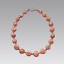 Le collier comprend vingt perles cylindriques aux faces bombées : leurs dimensions et leur couleur, variant du rouge-corail au brun-rouge, sont assez uniformes. Chaque perle est ornée de motifs géométriques peints en blanc qui sont à l’origine de la terminologie en anglais. Elles sont obtenues en chauffant à plusieurs reprises (jusqu’à douze fois, environ à 200o-300o) des galets d’une variété particulière d’agate : le processus leur confère cette couleur rouge intense. Les motifs blancs apparaissent en dessinant sur la surface avec une pâte à base de bicarbonate de soude qui, chauffée, devient pratiquement indélébile.