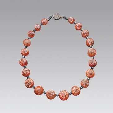 Le collier comprend vingt perles cylindriques aux faces bombées : leurs dimensions et leur couleur, variant du rouge-corail au brun-rouge, sont assez uniformes. Chaque perle est ornée de motifs géométriques peints en blanc qui sont à l’origine de la terminologie en anglais. Elles sont obtenues en chauffant à plusieurs reprises (jusqu’à douze fois, environ à 200o-300o) des galets d’une variété particulière d’agate : le processus leur confère cette couleur rouge intense. Les motifs blancs apparaissent en dessinant sur la surface avec une pâte à base de bicarbonate de soude qui, chauffée, devient pratiquement indélébile.