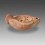 Lampe Romaine en Terre Cuite avec Scène Erotique moulée à l’argile orange, de dimensions moyennes. L’épaule est légèrement inclinée et ornée de stries obliques. Anse pleine, faite à la main. Bec rond, délimité par un sillon rectiligne. Base plate, mais définie par un cercle légèrement creux. Trou d’évent percé au centre du médaillon.